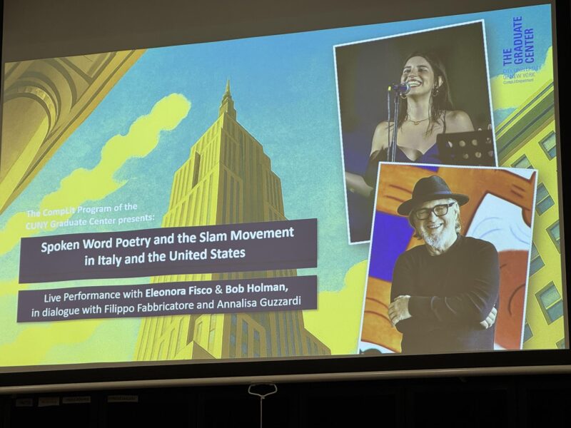 On October 3, at the CUNY Graduate Center, I recorded a conversation between Bob Holman and Eleonora Fisco about the Spoken Word and Slam Poetry. They also discussed the important work poetry does in keeping languages alive, and they performed a few poems throughout, alone and together. Filippo Fabbricatore and Annalisa Guzzardi interviewed and guided this intriguing talk. You’ll find it in the Vimeo below. Enjoy.